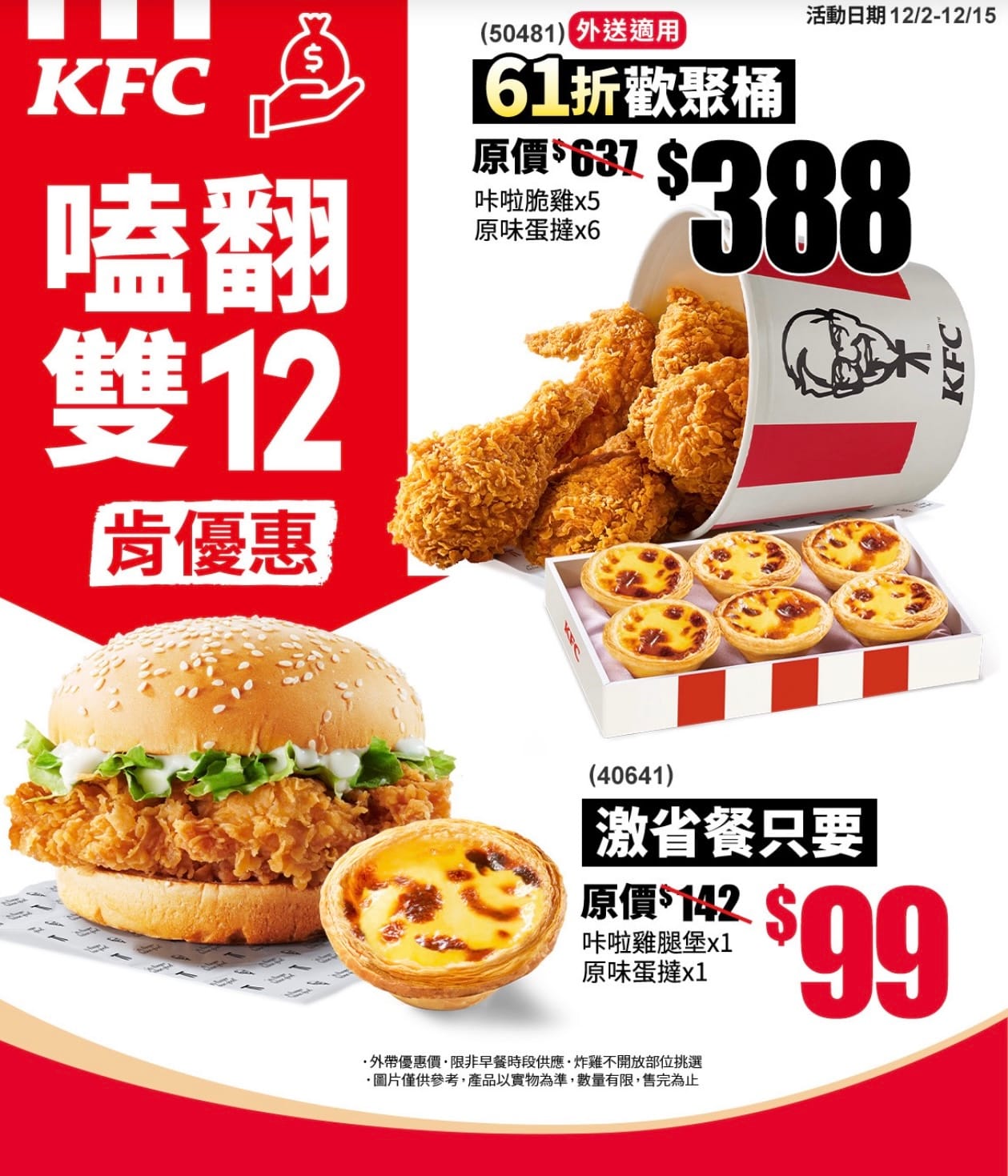 優惠內容:咔啦脆雞 ×5 原味蛋撻 ×6