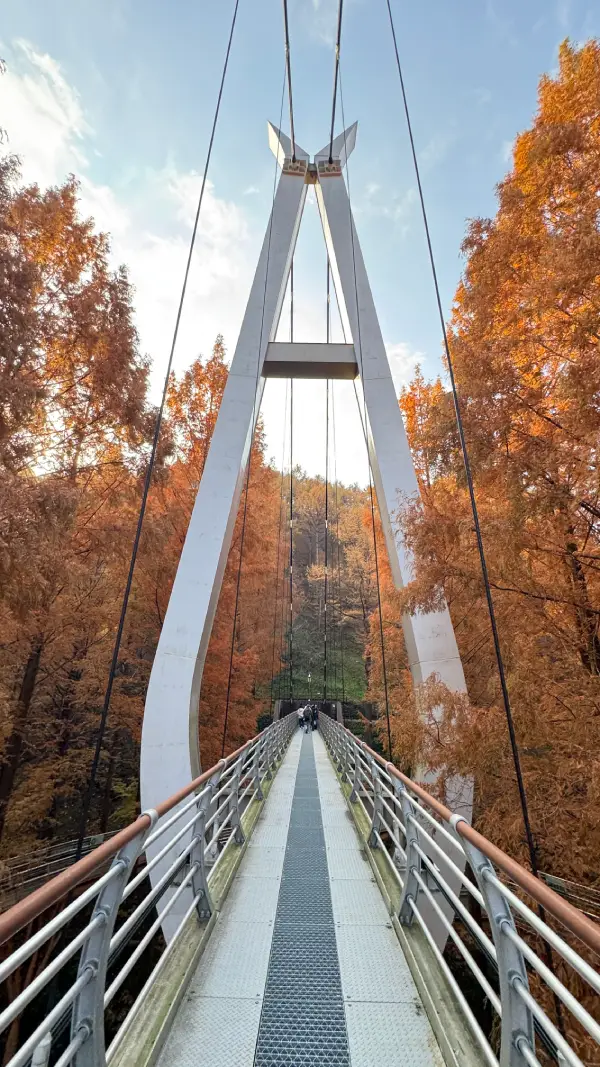 站在吊橋上,兩側都是金橘色水杉林,視野非常開闊。
