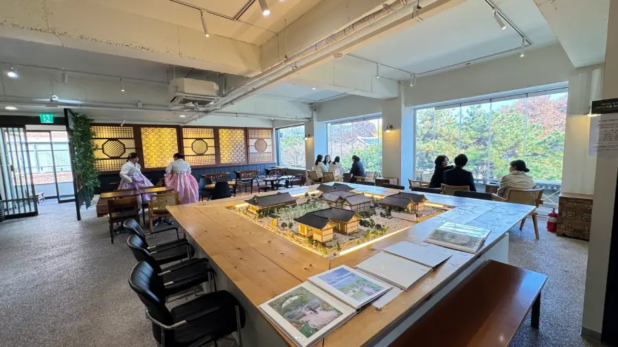 二樓中間的桌子上有韓屋村裡的微縮模型