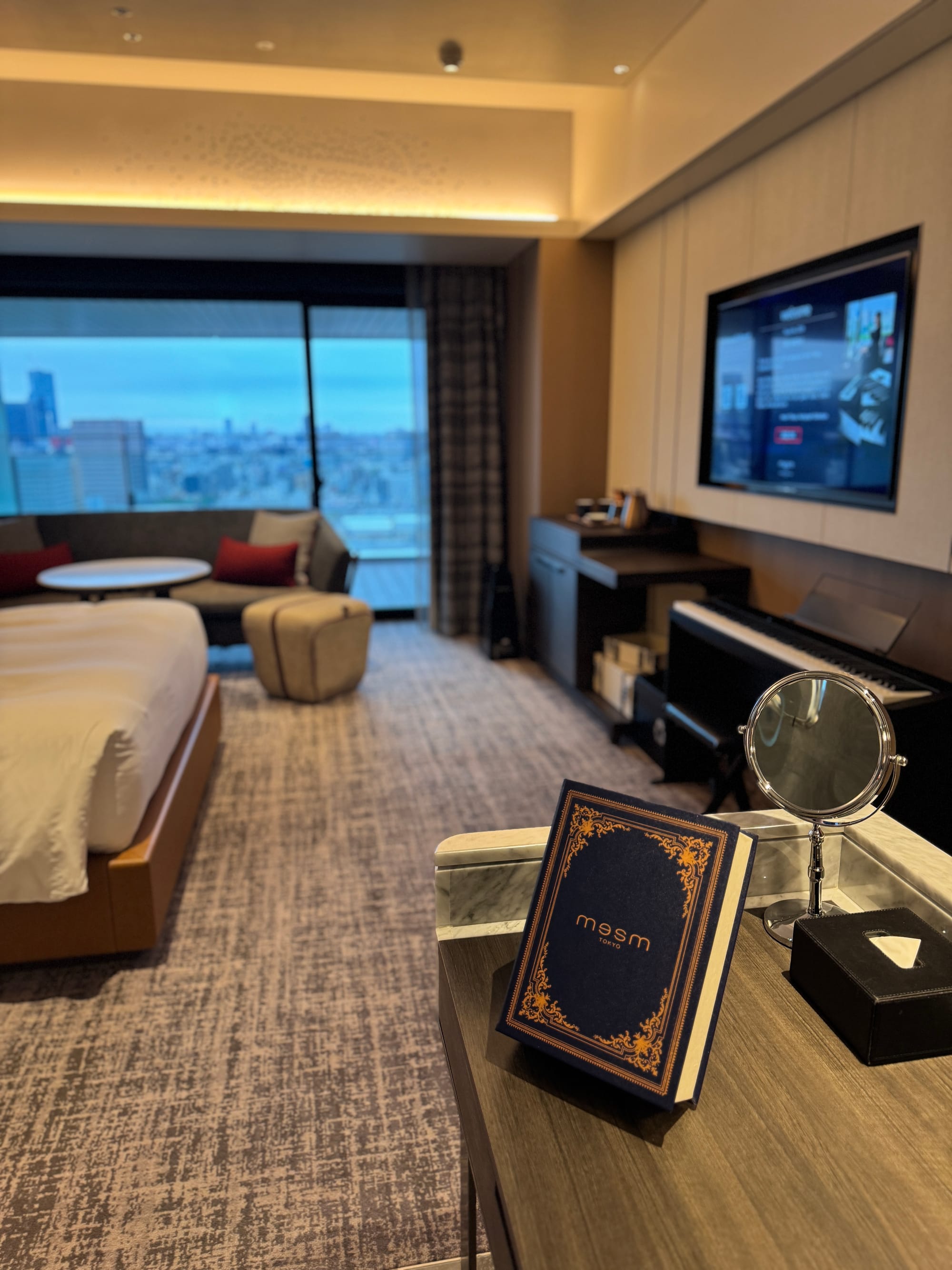 用 85k 萬豪免房券入住 Mesm Tokyo,一晚補點 10k 換到 95k 點房型。白金會員實測有早餐兩客、延退 13:00、安排陽台房。房內電子琴、五感設計、Whisk 夜景+現場演奏都超有記憶點,是值得把免房券花在這裡的一次住宿。