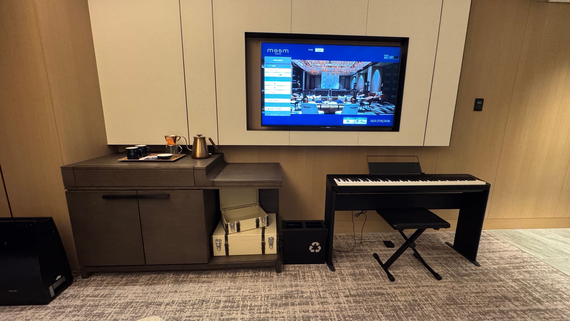 房內的 Casio Privia 電子琴不只是擺設,而是真正能彈奏的完整數位琴,同時具備藍牙喇叭功能。無論是播放手機音樂、練習旋律,或在夜景前輕輕彈幾個和弦,整個空間的氛圍都會被拉開層次,變成一場小型的私人表演。