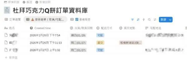 搭配 Notion 的看板模式(Board View),能快速看出目前有哪些訂單待處理,以及各取貨方式的數量分布。