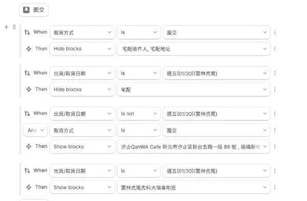 這是我最喜歡的功能。接單時最怕客人選錯選項,而 Tally 可以設定「條件顯示」。例如: